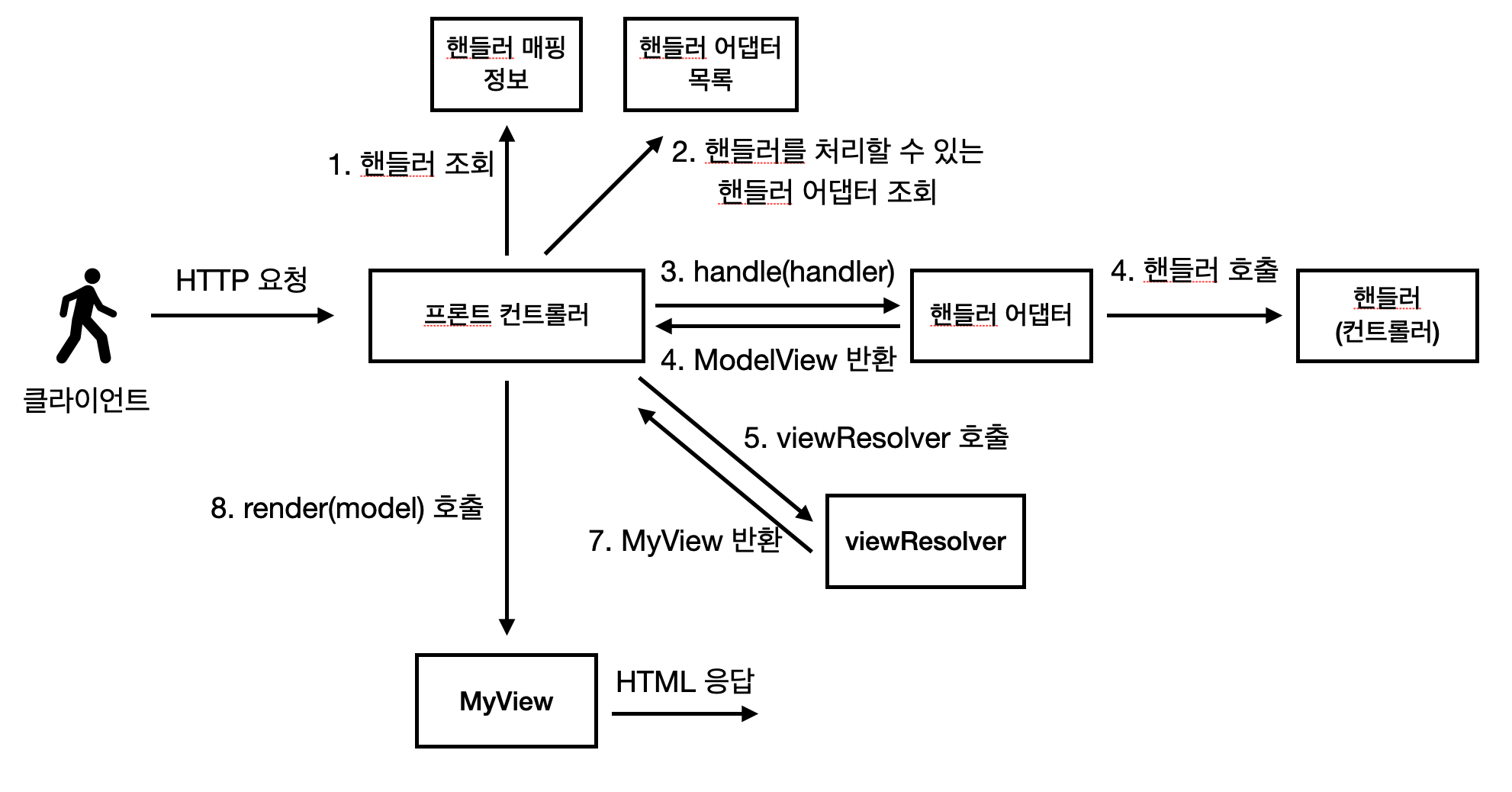 *더이상 프론트 컨트롤러가 실제 컨트롤러를 호출하지 않고, 어댑터를 통해 실제 컨트롤러가 호출된다.