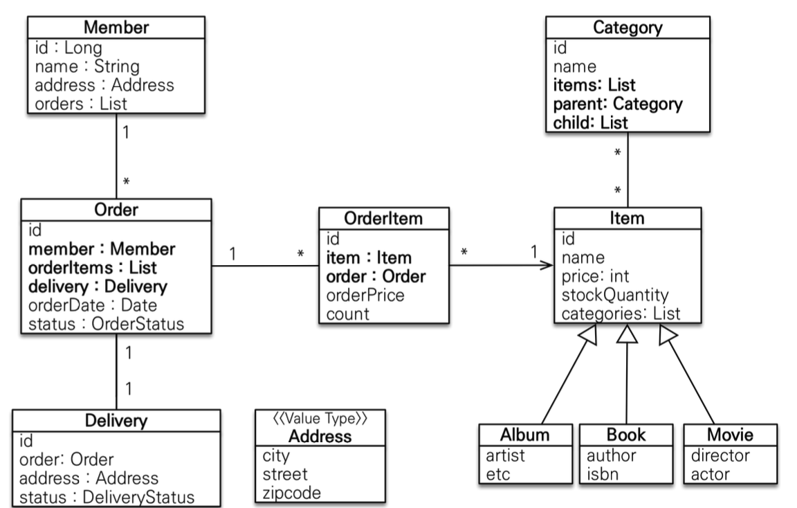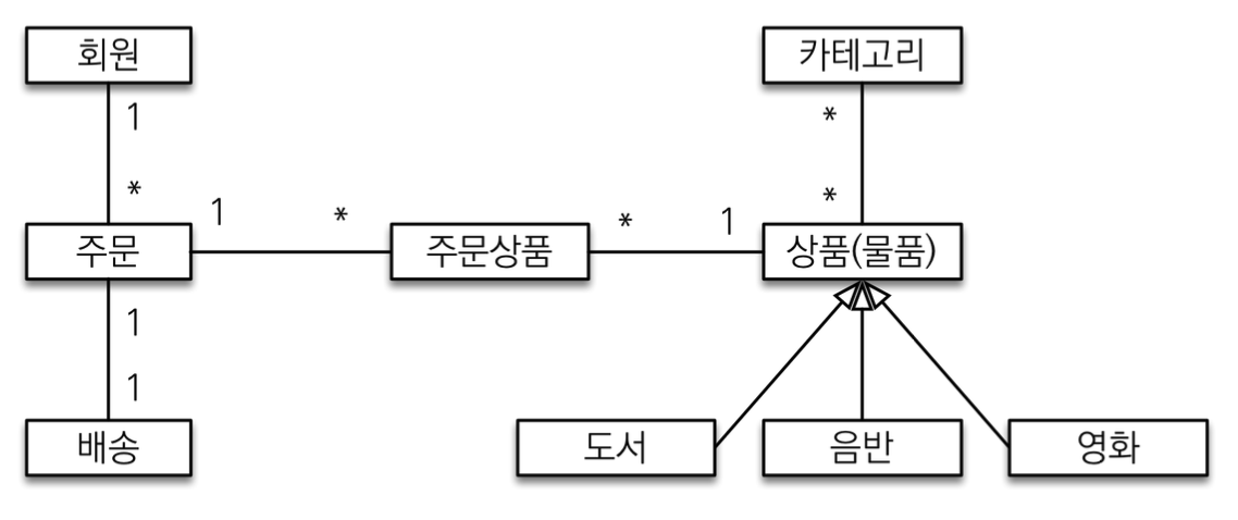 - 카테고리와 상품: '@ManyToMany' 를 사용해서 매핑한다.(실무에서 @ManyToMany는 사용하지 말자. 여기서는 다대다 관계를 연습하기 위해 추가했다.)