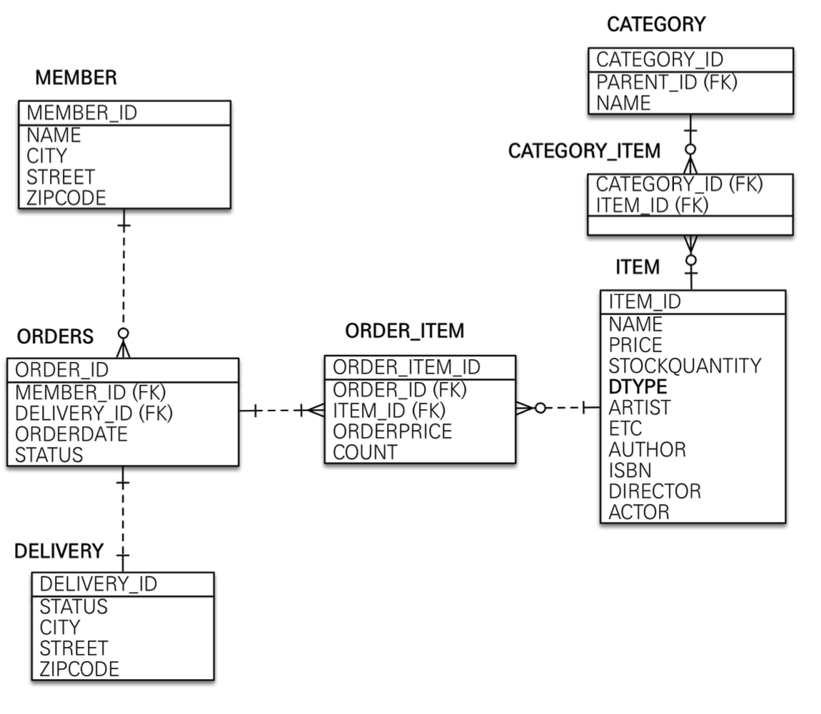 - 주문상품과 상품: 다대일 단방향 관계다. 'OrderItem.item' 을 'ORDER_ITEM.ITEM_ID' 외래 키와 매핑한다.