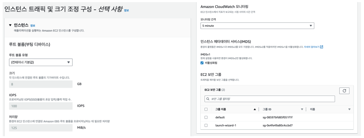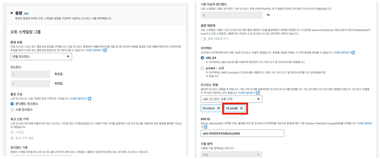 다만 용량 부분에서 인스턴스 유형에 t3.small이 디폴트로 선택되어있는데, t3.micro가 프리티어 제한이라 t3.small을 제거해주었다.
