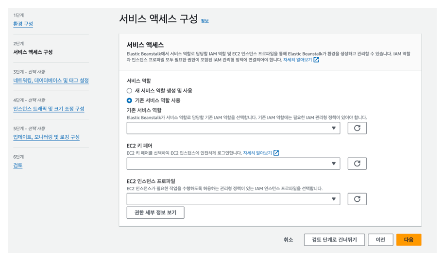 미리 EC2로의 배포를 시도해보면서 서비스 역할을 생성해놓았다. 그래서 기존 서비스 역할 사용을 선택해 서비스 역할, 키 페어, 인스턴스 프로파일을 선택했다.