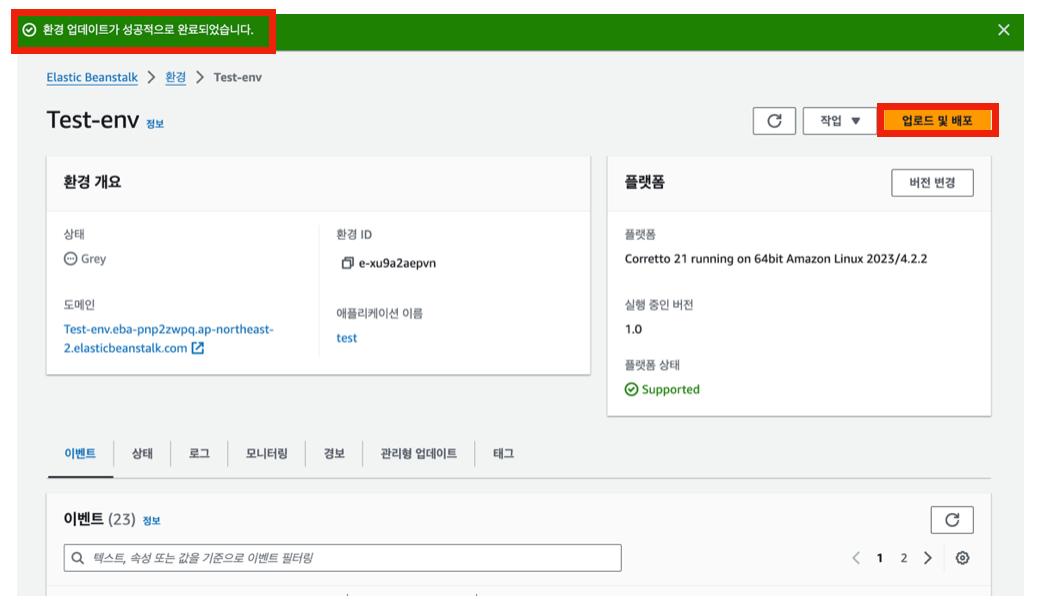(./gradlew build -> build > libs > SNAPSHOT.jar 업로드) => 처음에 zip파일을 잘못올려서 실패한 스샷인데 성공한 스샷을 찍지 못해 이걸로 대체합니다..