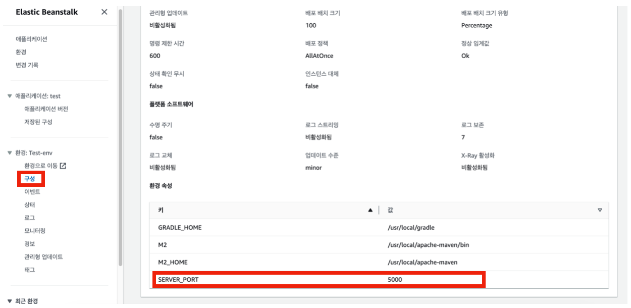 결국 블로그에서와 같이 Elastic Beanstalk 환경 속성에서 SERVER_PORT를 직접 추가해주었다.